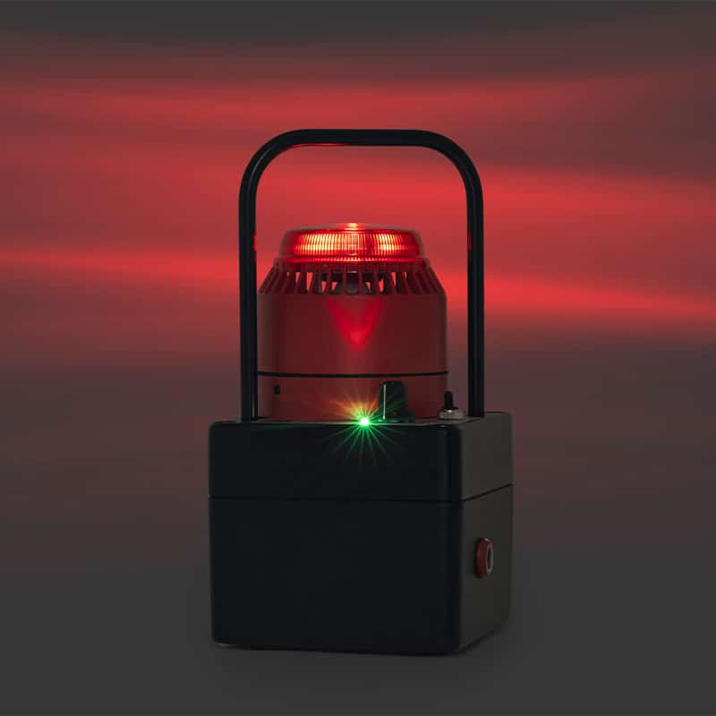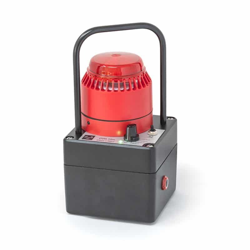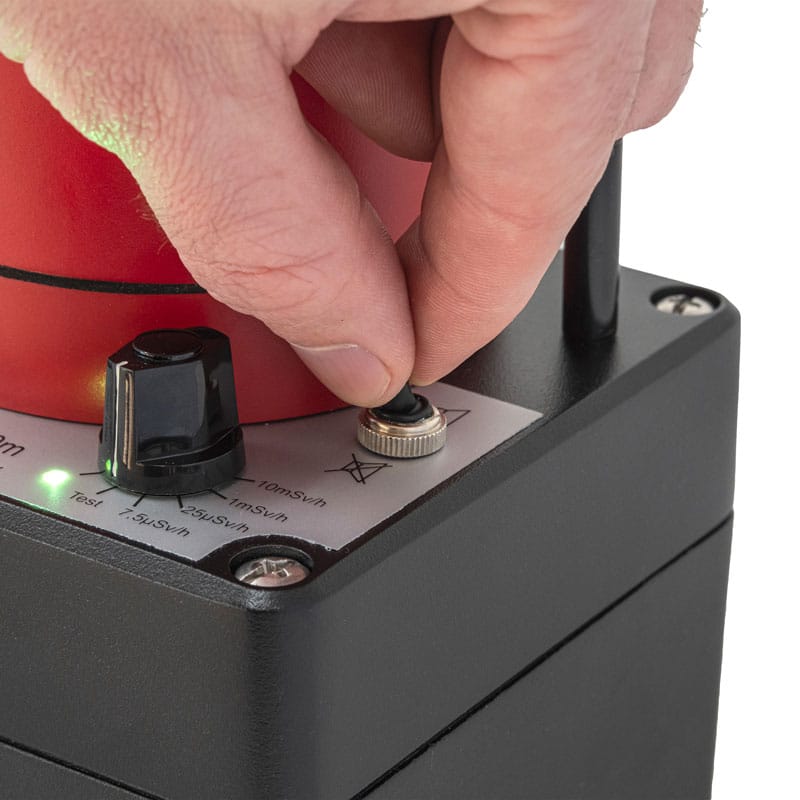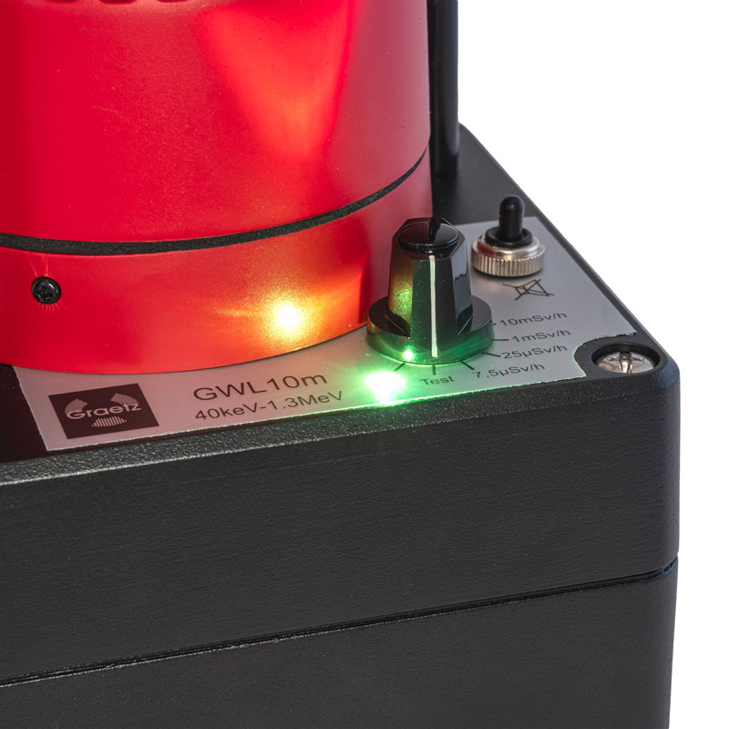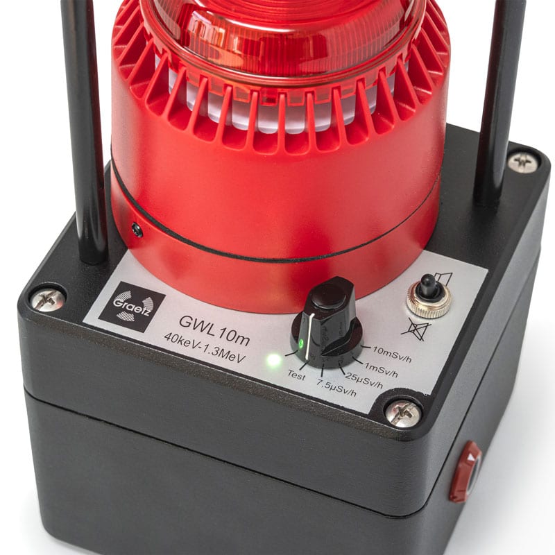 Die akkubetriebene Gammastrahlungswarnleuchte GRAETZ GWL 10m wird zur Ermittlung von Absperrbereichen und zur Raumüberwachung eingesetzt. Das Überschreiten einer der vier einstellbaren Warnschwellen wird optisch mit einem roten Blitzlicht und akustisch mit einem sehr lauten Alarmton quittiert. Die Gammastrahlungswarnleuchte GRAETZ GWL10m ist mit einem optionalen Bewegungsmelder erhältlich, der bei Annäherung einer Person an den Gefahrenbereich den akustischen Alarm auslöst.